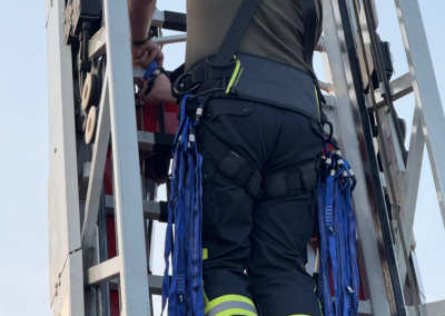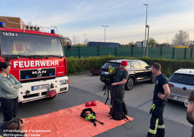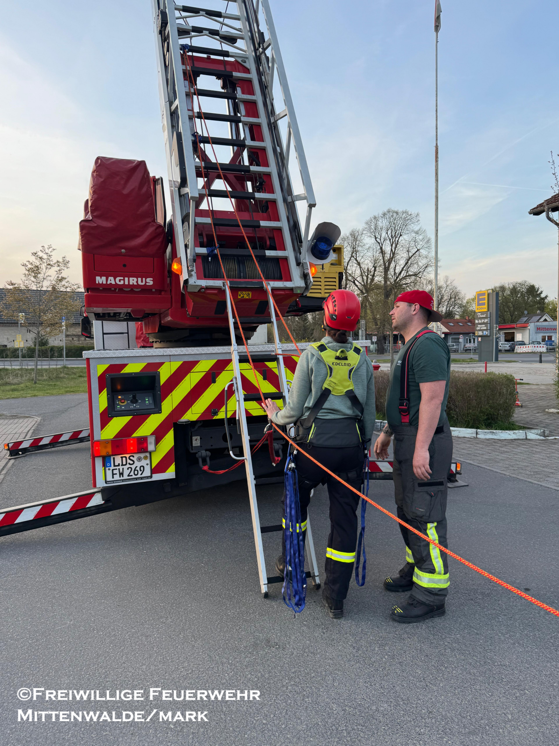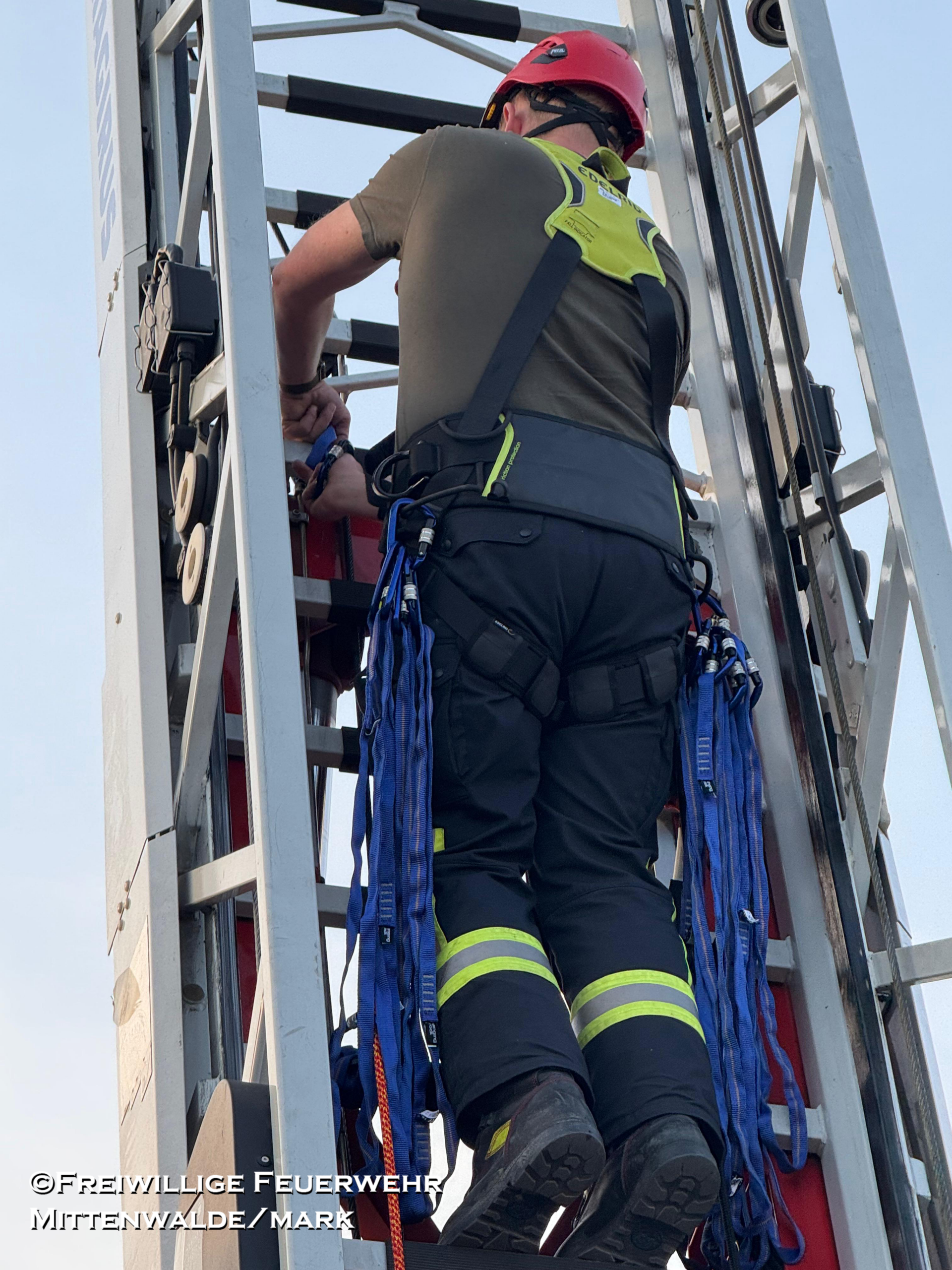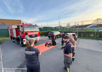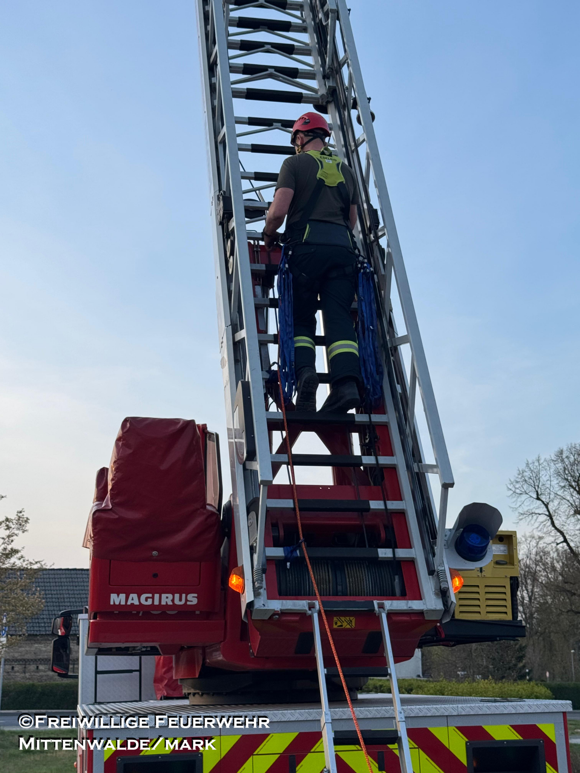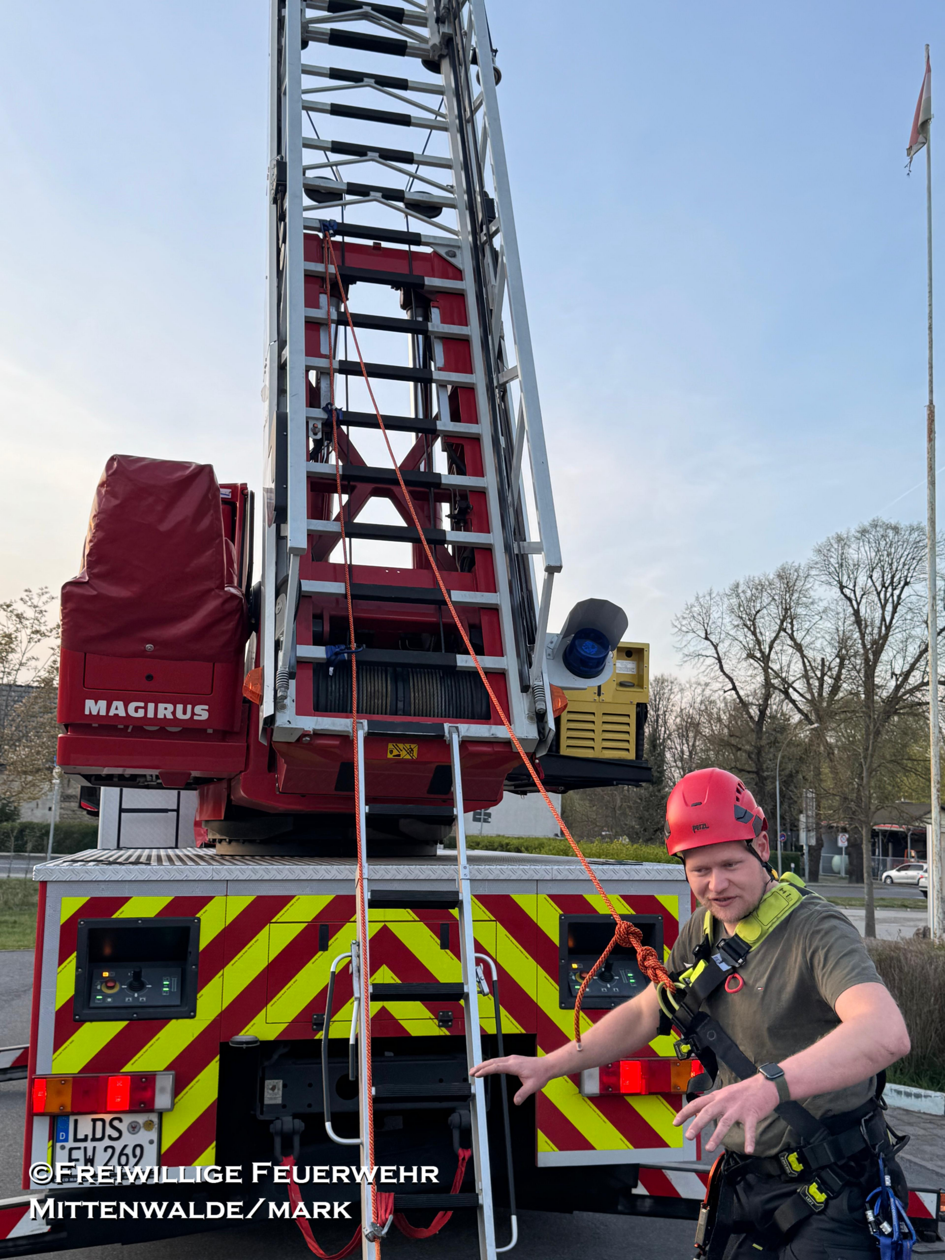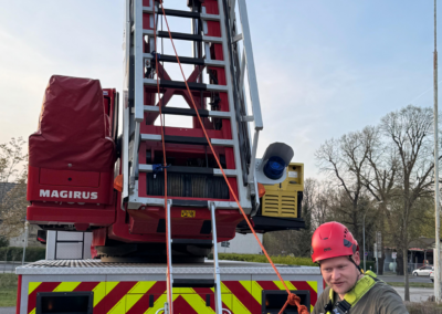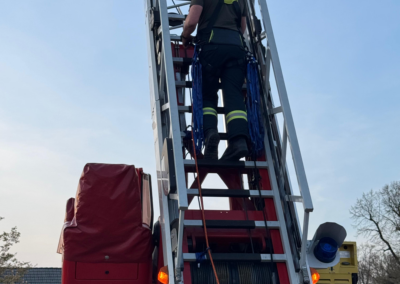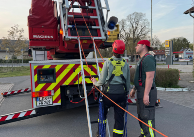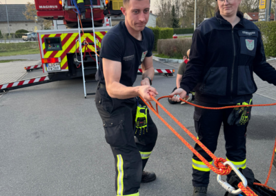 Den Abschluss der Ausbildungsreihe bildete am Freitag, den 17.04.2026, ein Ausbildungsdienst mit dem Thema „Absturzsicherung“. Ziel dieses Dienstes war es, den sicheren Umgang mit dem Absturzsicherungssystem zu vermitteln und die grundlegende Handhabung der entsprechenden Ausrüstung zu festigen. Zu Beginn erfolgte eine theoretische Einweisung in die Bestandteile des Systems, bei der die einzelnen Komponenten vorgestellt und deren richtige Verwendung erläutert wurden. Besonderes Augenmerk lag hierbei auf den grundlegenden Sicherheitsregeln beim Arbeiten in absturzgefährdeten Bereichen. Im anschließenden praktischen Teil konnten die Kameradinnen und Kameraden den Umgang mit dem Absturzsicherungssystem üben. Dabei wurde das richtige Anlegen der Ausrüstung sowie die korrekte Handhabung der Sicherungssysteme demonstriert und praktisch nachvollzogen. Zusätzlich wurden verschiedene Einsatzmöglichkeiten und typische Anwendungsfälle besprochen. Auch wenn das Absturzsicherungssystem im Einsatzfall ausschließlich von Kameradinnen und Kameraden mit entsprechendem Lehrgang verwendet werden darf, war dieser Dienst für alle Teilnehmer von großem Interesse und bot insbesondere den noch nicht ausgebildeten Kräften wichtige Einblicke in die Funktionsweise und Einsatzmöglichkeiten des Systems.