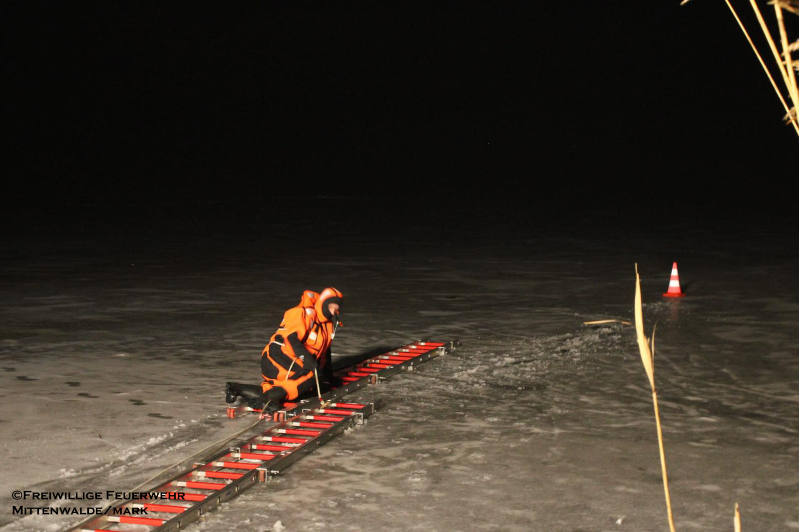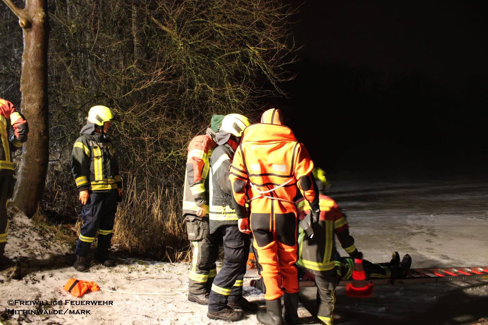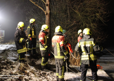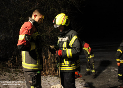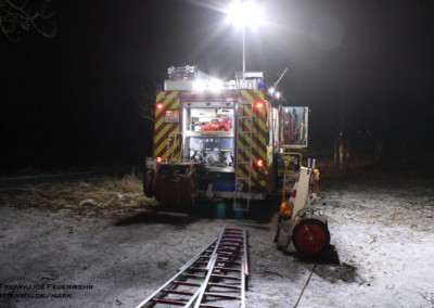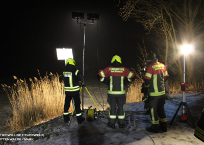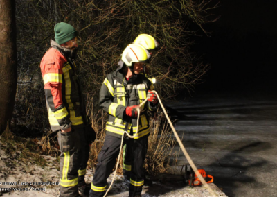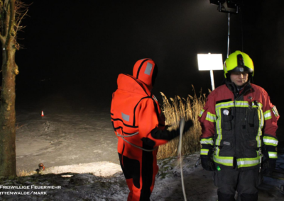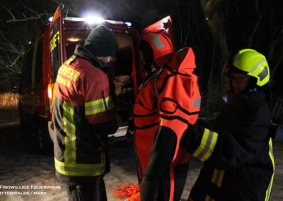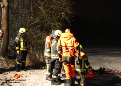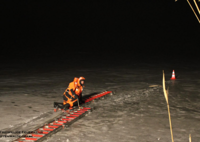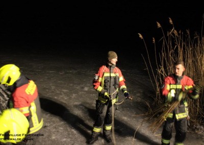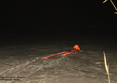 Am 06.02.2026 folgte ein praxisnaher Ausbildungsdienst zum Thema „Eisrettung“. Aufgrund der anhaltend frostigen Temperaturen und zugefrorener Gewässer im Einsatzgebiet besaß dieses Thema besondere Aktualität. Nach einer theoretischen Einweisung zu Gefahren, Einsatztaktik und Eigensicherung am See wurden im praktischen Teil am Tonsee realitätsnahe Szenarien trainiert. Geübt wurden unter anderem das Vorgehen mit Steckleitern zur Lastverteilung auf dem Eis sowie der Einsatz von Rettungsleinen. Der Grundsatz „Eigensicherung vor Fremdrettung“ stand dabei stets im Mittelpunkt. Die Übung verlief ohne Zwischenfälle und verdeutlichte die Bedeutung regelmäßiger Ausbildung für seltene, aber risikoreiche Einsatzlagen.
