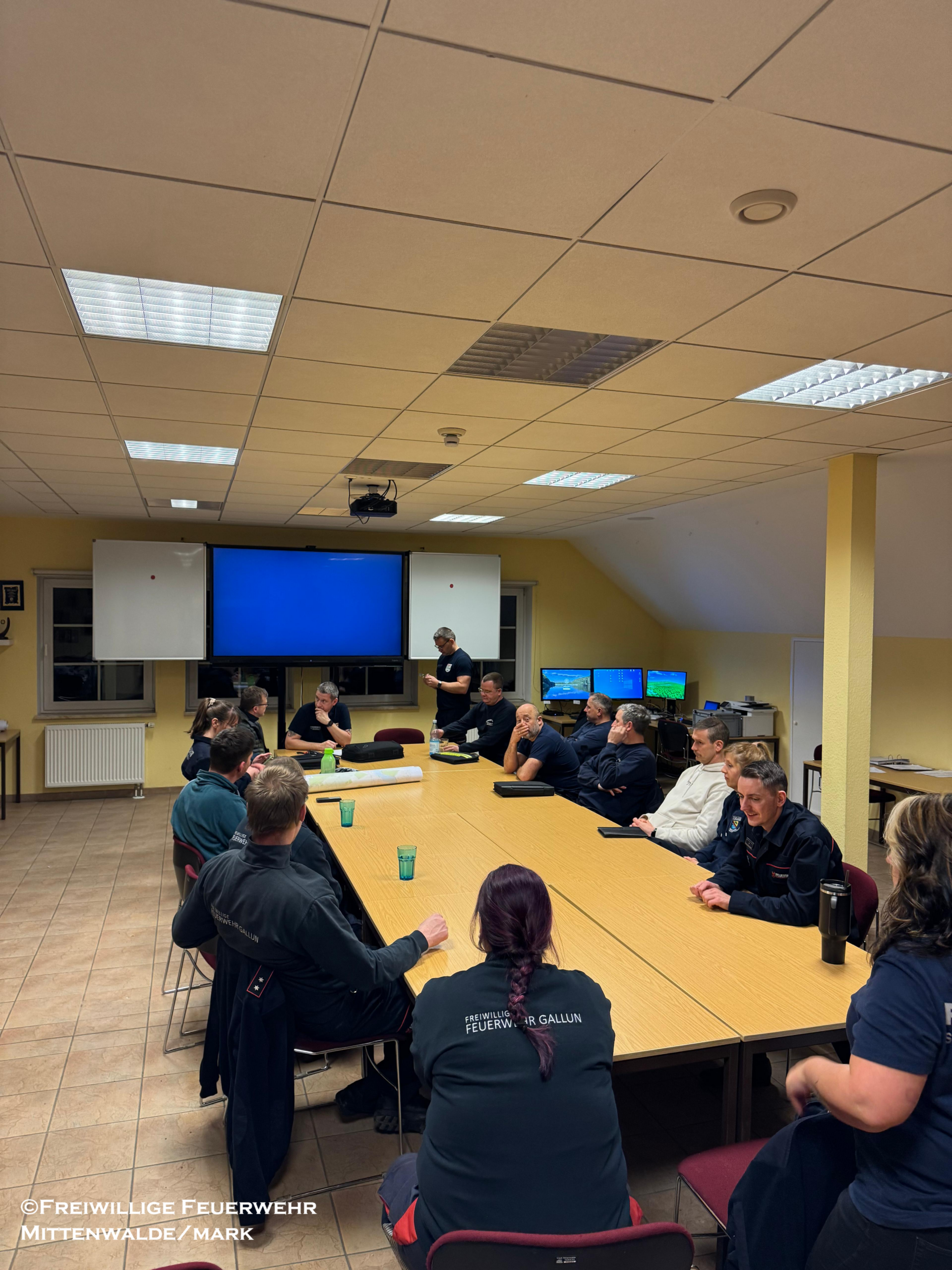 Am 18.02.2026 tagte das Führungshilfspersonal im Gerätehaus Gallun. Insgesamt 20 Kameraden aus dem gesamten Stadtgebiet nahmen teil. Themenschwerpunkte waren eine Einweisung in die Alarmierungssoftware „WebView“ inklusive Überprüfung der Zugänge, die Aktualitätskontrolle der Lagekarten sowie der praktische Aufbau der Fremdeinspeisung der Befehlsstelle zur Sicherstellung der Stromversorgung bei Ausfällen. Zusätzlich wurden Informationen zum Umbau des Einsatzleitwagens (ELW) bekanntgegeben, einschließlich eines Zeitplans für dessen Rückkehr sowie erster Termine zur Einweisung am modernisierten Fahrzeug.