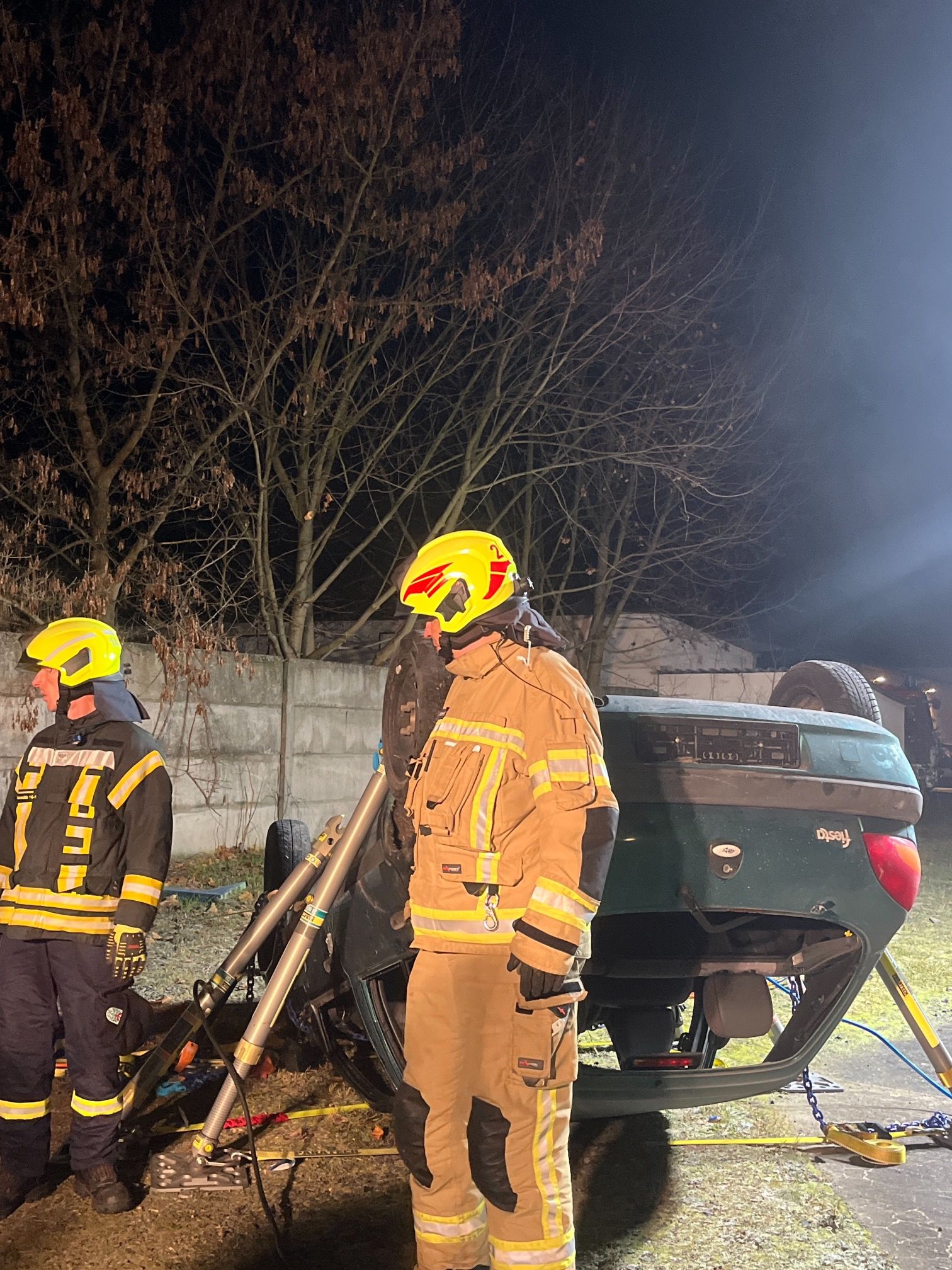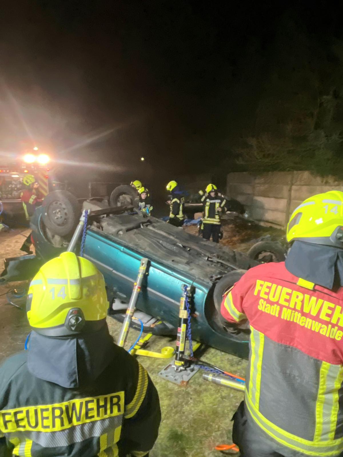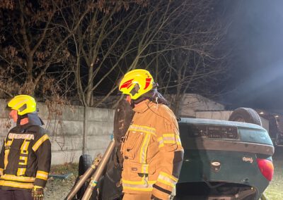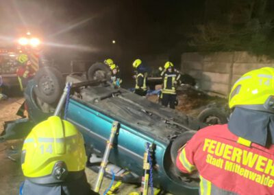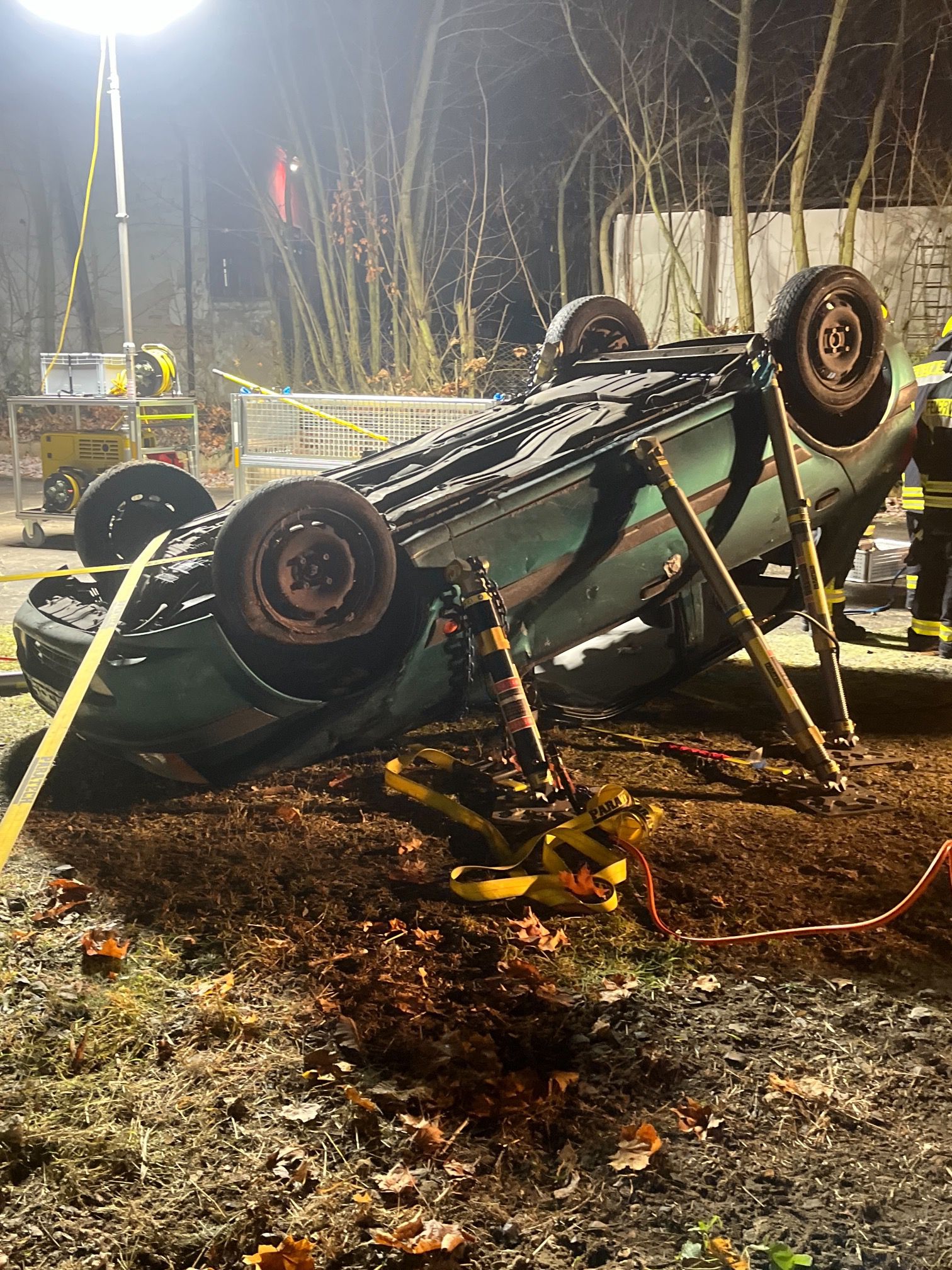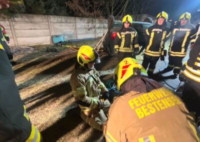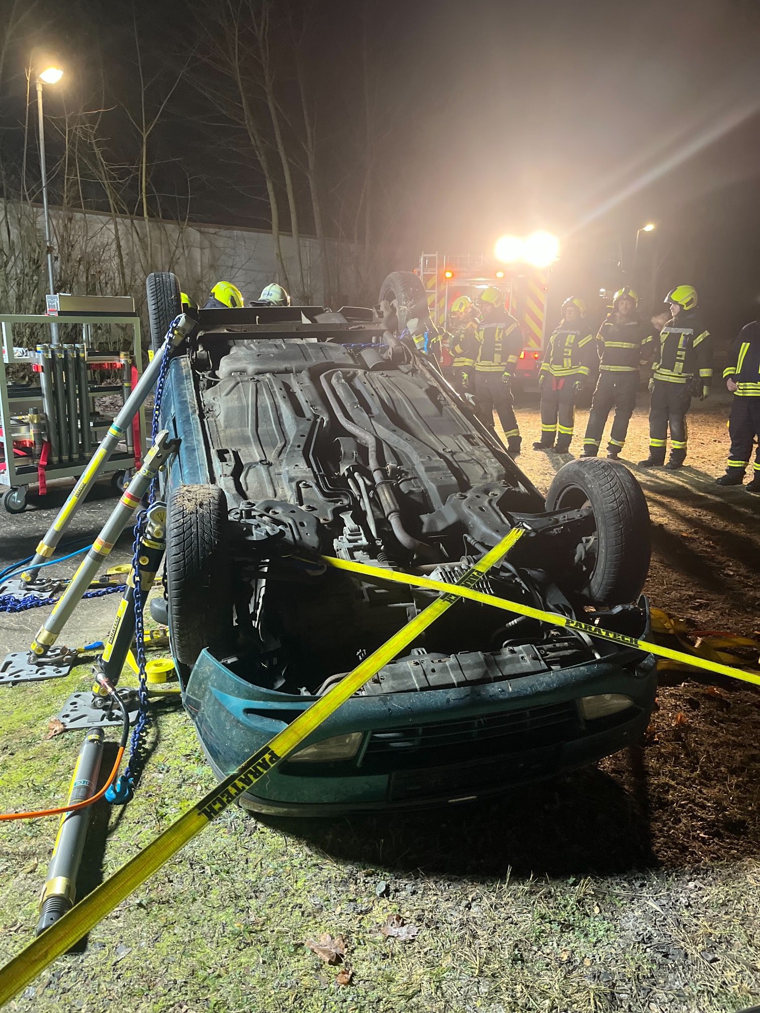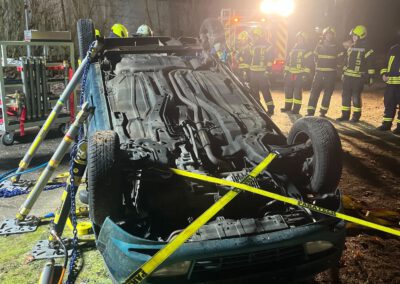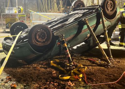 Die zweite Gruppe hatte es mit einem praxisnahen Szenario zu tun: Ein Pkw wurde gemeinsam auf das Dach gelegt und anschließend mit dem Paratech-System stabilisiert. Aufgabe war es, das Fahrzeug kontrolliert anzuheben, um eine eingeklemmte Person im Bereich des Motorraums zu retten. Durch gute Abstimmung, kreatives Vorgehen und Teamarbeit konnte die Aufgabe erfolgreich umgesetzt werden.