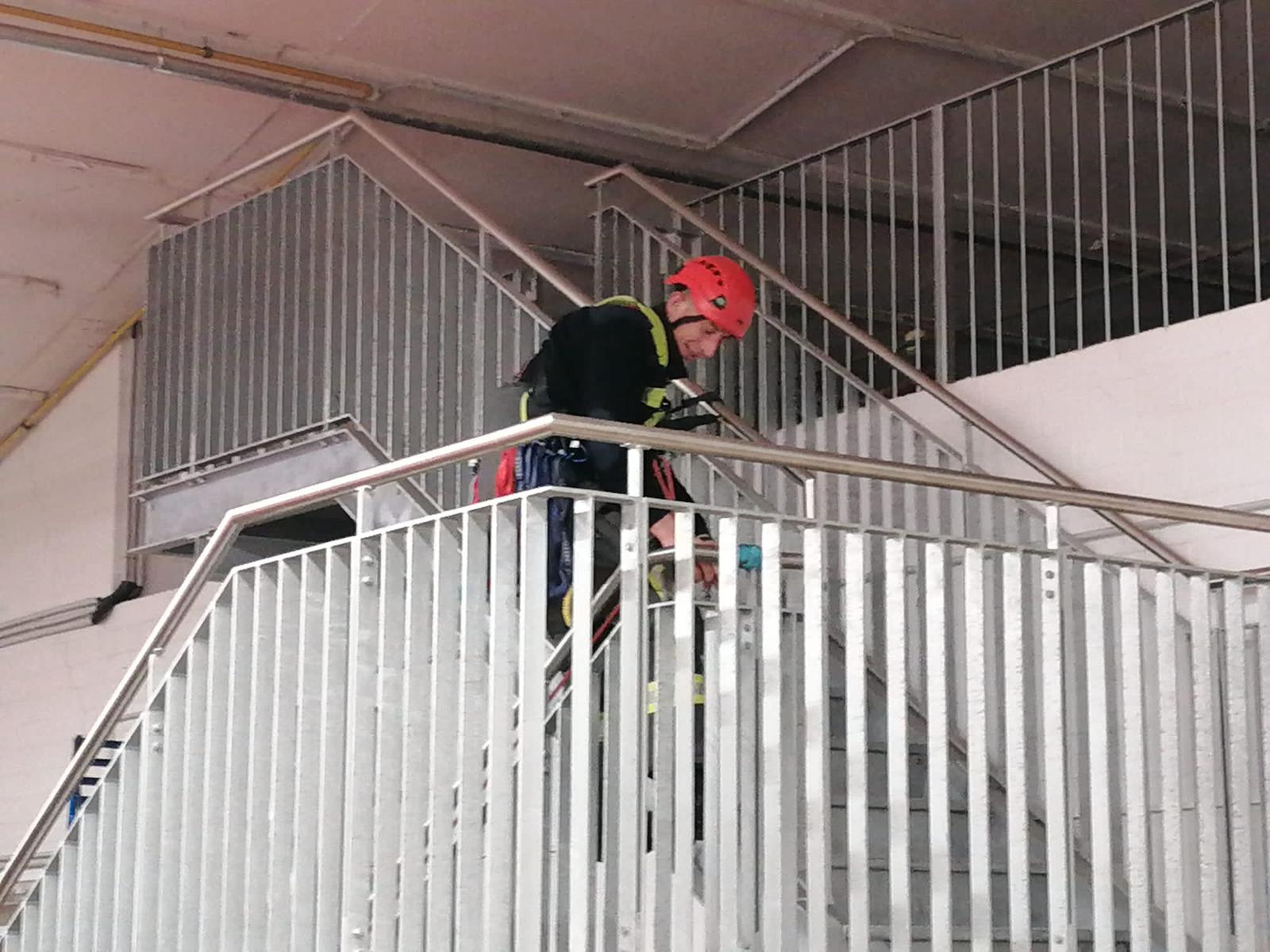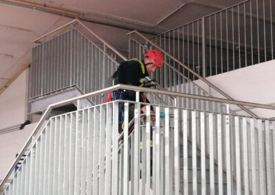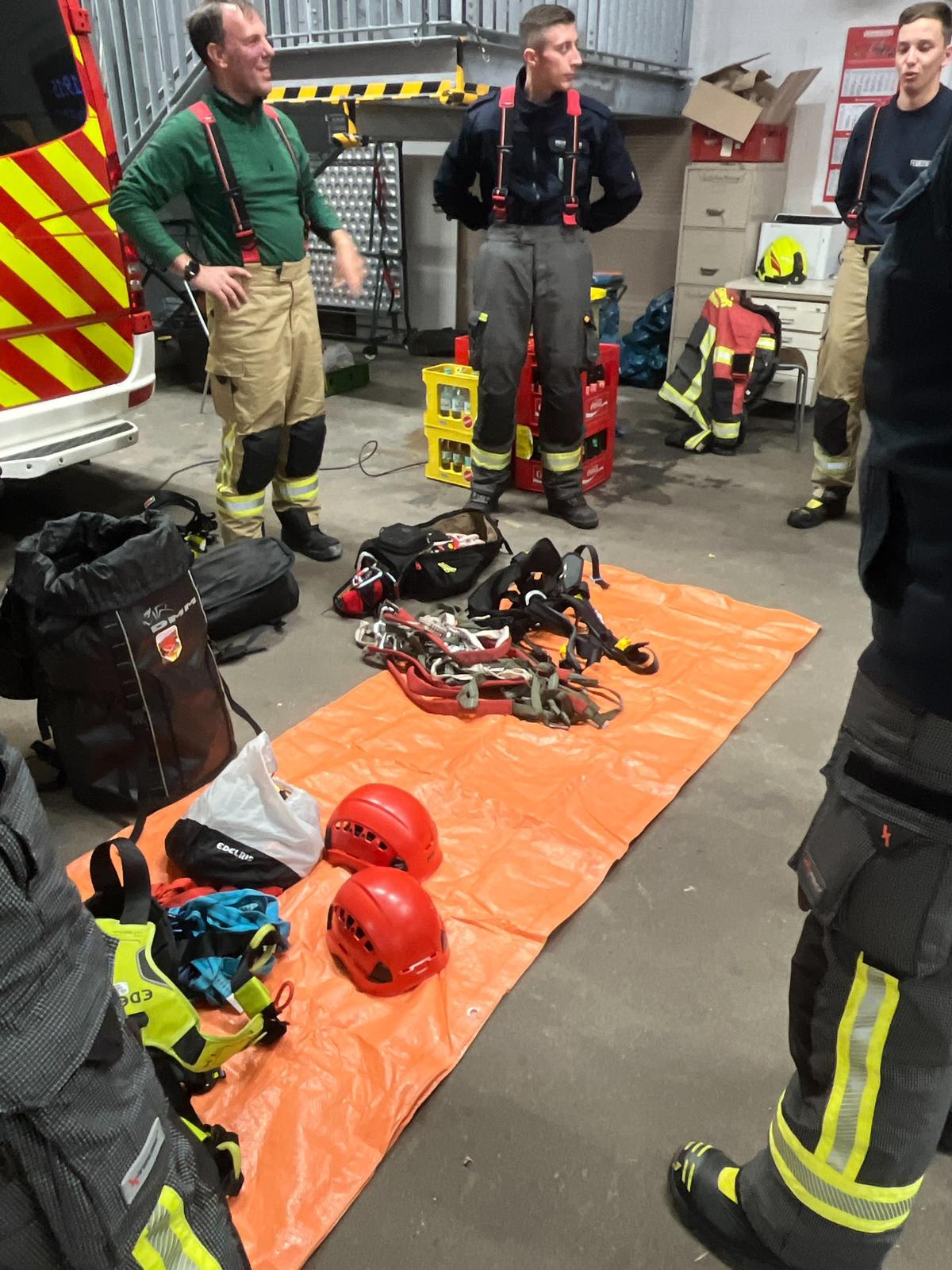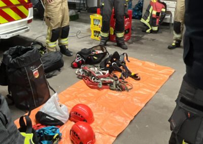 In der ersten Gruppe Absturzsicherung stand zunächst die theoretische Durchsicht des vorhandenen Materials im Vordergrund. Dabei wurde besprochen, welche Komponenten der Sicherungssatz umfasst und welche Punkte vor dem Einsatz zwingend zu beachten sind. Im Anschluss folgte eine praktische Übung, bei der ein waagerechter Vorstieg entlang eines Geländers durchgeführt wurde. Mehrere Sicherungspunkte mussten dabei korrekt gesetzt werden, um ein sicheres Vorgehen zu gewährleisten.