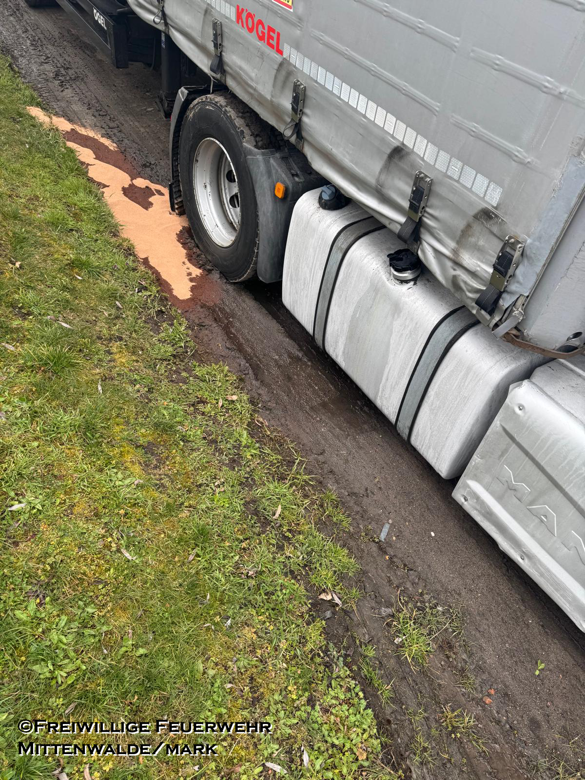 Vor Ort bestätigte sich die Lage. Aufgrund eines undichten Tankdeckels sowie der Schräglage des LKW lief bereits seit mehreren Stunden Diesel aus dem Tank.