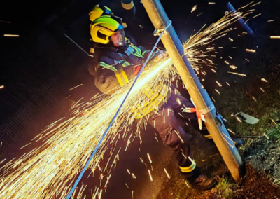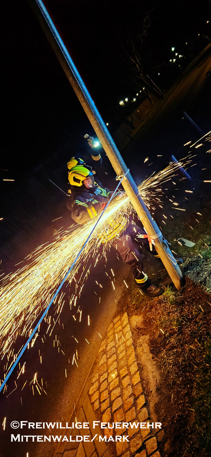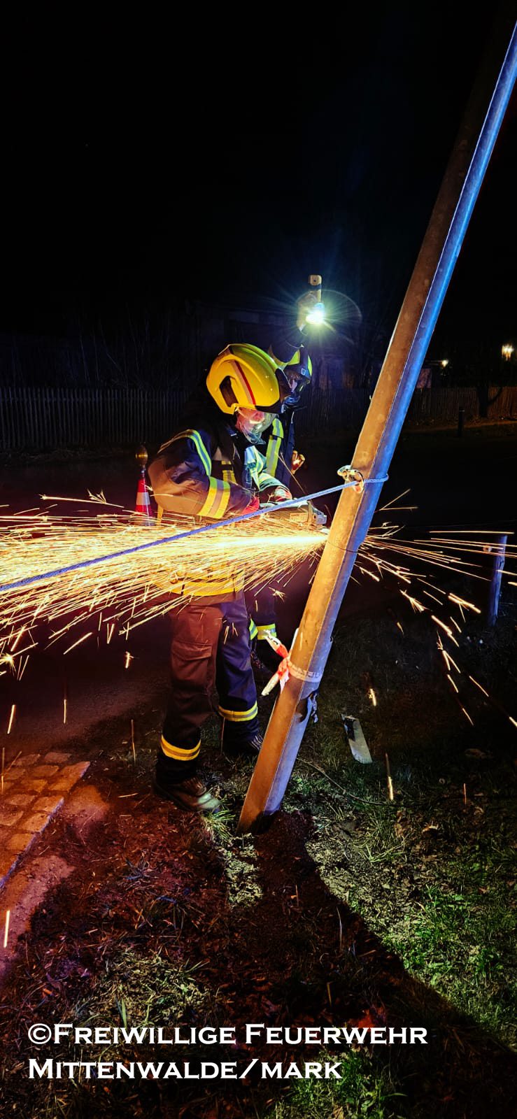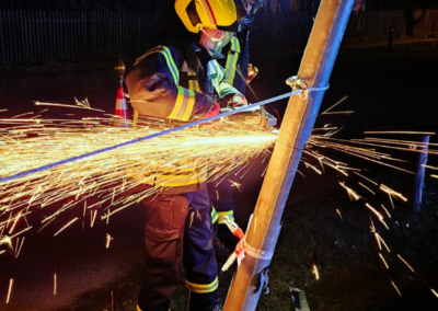 Vor Ort bestätigte sich die Lage. Wir sicherten die Einsatzstelle sowie die beschädigte Laterne ab. Anschließend wurde diese mittels Trennschleifer abgetrennt und am Straßenrand gesichert abgelegt.